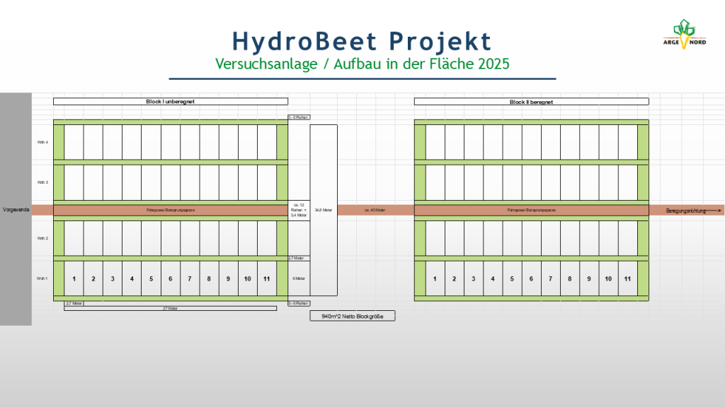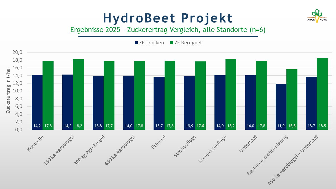 In den letzten Jahren hat die Zuckerrübe in vielen Regionen unter extremer Trockenheit gelitten. Besonders im Regenschatten des Harzes, als auch in den Beregnungsgebieten, in denen die Beregnungsmengen weiter eingeschränkt werden, tritt das Problem des Trockenstresses gehäuft auf. Aus diesem Grund hat die ARGE NORD eine Versuchsserie angelegt, um das Thema Wassernutzung und Trockenheit weiter in der Diskussion zu halten und Lösungsansätze zu finden. Ziel dabei ist es bei der Rübe die begrenzte Menge des Wassers besser auszunutzen. Das Wasser soll länger Pflanzenverfügbar gebunden werden, um Beregnungsgaben weiter auseinander ziehen und seltenere Niederschlagsereignisse besser ausnutzen zu können.