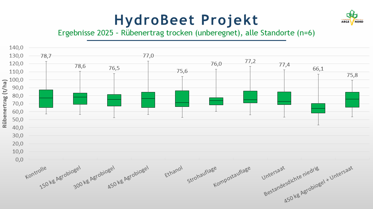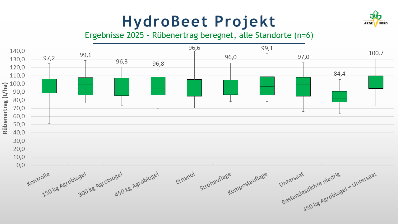 Das Ethanol in der Variante 9 wurde im Sommer mit der Spritze ausgebracht. Zum Zeitpunkt der Applikation wurden mehrere Wochen Trockenheit vorhergesagt. Das Ethanol soll die Stomata der Rübenblätter schließen und somit die Verdunstung über die Blätter reduzieren. Über das Versuchsjahr hinweg konnte man leichte optische Unterschiede in den Varianten feststellen. Beispielsweise war zu erkennen das auf einzelnen Standorten Rüben in den Varianten mit der Mulchauflage später angefangen haben unter Trockenstress zu leiden. Nach der Ernte und der Auswertung kam heraus, dass es keine signifikanten positiven Ertrags- und Qualitätseffekte zwischen den einzelnen Varianten innerhalb der Blöcke gab. Lediglich ein negativer Effekt konnte herausgearbeitet werden. So lagen die Rüben- und Zuckererträge der Variante mit der reduzierten Bestandesdichte deutlich unterhalb der Kontrollvariante. Deutlich war auch zu erkennen, dass der Zuckerertrag in den Blöcken ohne Beregnung im Durchschnitt vier Tonnen unterhalb den Blöcken mit Beregnung lag.
