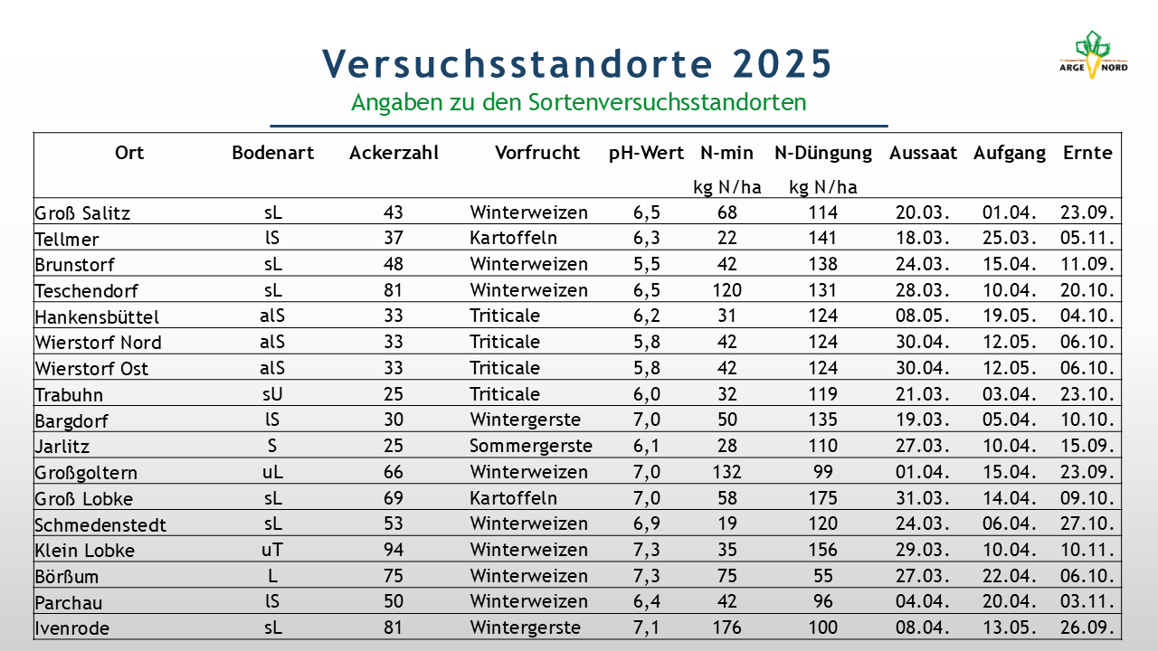 Die ARGE NORD legte 2025 ihre Sortenversuche wieder in allen Anbauregionen der Nordzucker AG an. Unsere Standorte bilden die verschiedenen Gegebenheiten Norddeutschlands hinsichtlich der unterschiedlichen Bodenarten und Klimabedingungen ab.