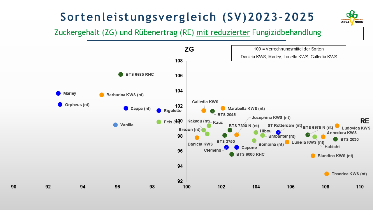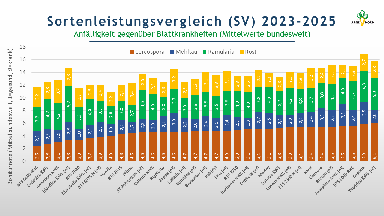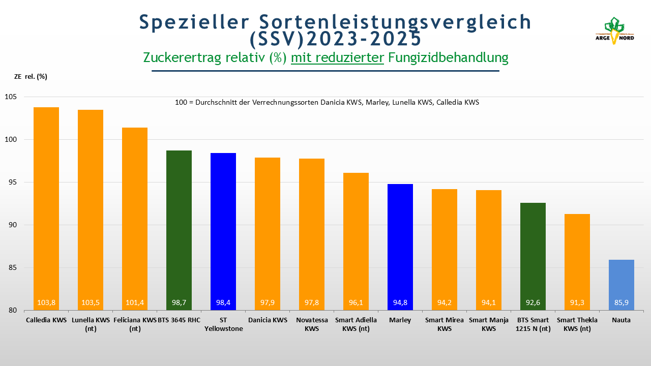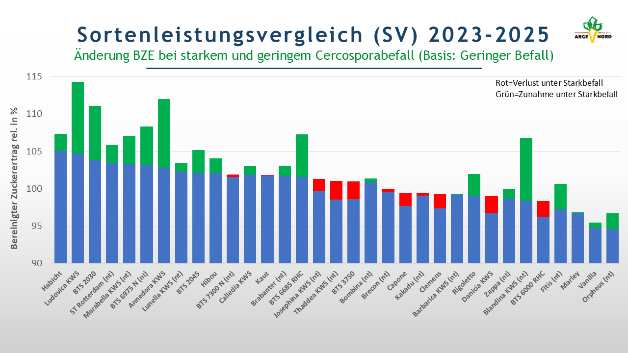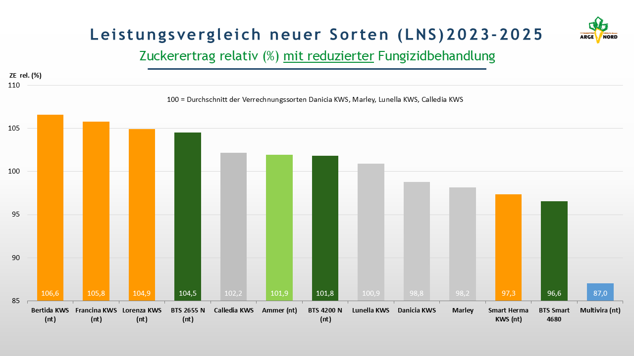 Seit 2024 werden Sortenversuche als Blockanlage in dreifacher Wiederholung angelegt, es gibt nur noch eine Fungizidstufe. Die Versuche ohne Nematodenbefall werden einfaktoriell mit stark reduziertem Fungizideinsatz geprüft. Die Auswertung der Versuche wird trotz der Einstufigkeit in mehreren Befallsstufen dargestellt. Dies wird durch eine Gruppierung der Versuchsergebnisse nach dem Befallsniveau an den jeweiligen Standorten ermöglicht. Je nachdem, wie stark der Befall mit Cercospora beticola ausfällt, kann die Rangfolge im Zuckerertrag oder bereinigten Zuckerertrag stark variieren. Die Darstellung der Sortenleistung erfolgt für 2023 übergangsweise als Mittel der Stufen 1 und 2 (Stufe D) und für 2024 und 2025 mit reduziertem Fungizideinsatz. Versuche mit Nematodenbefall oder Versuche, die auf andere Krankheiten wie SBR abzielen werden möglichst gesund gehalten, damit der Einfluss der Blattkrankheiten möglichst nicht das Ergebnis verfälscht. Feldaufgangszählungen finden im Leistungsvergleich neuer Sorten (LNS) und im SV statt. Da die nematodentoleranten Sorten hier ohne Befall mitgeführt werden, ist keine Zählung im SV-N und der WP-NT notwendig.