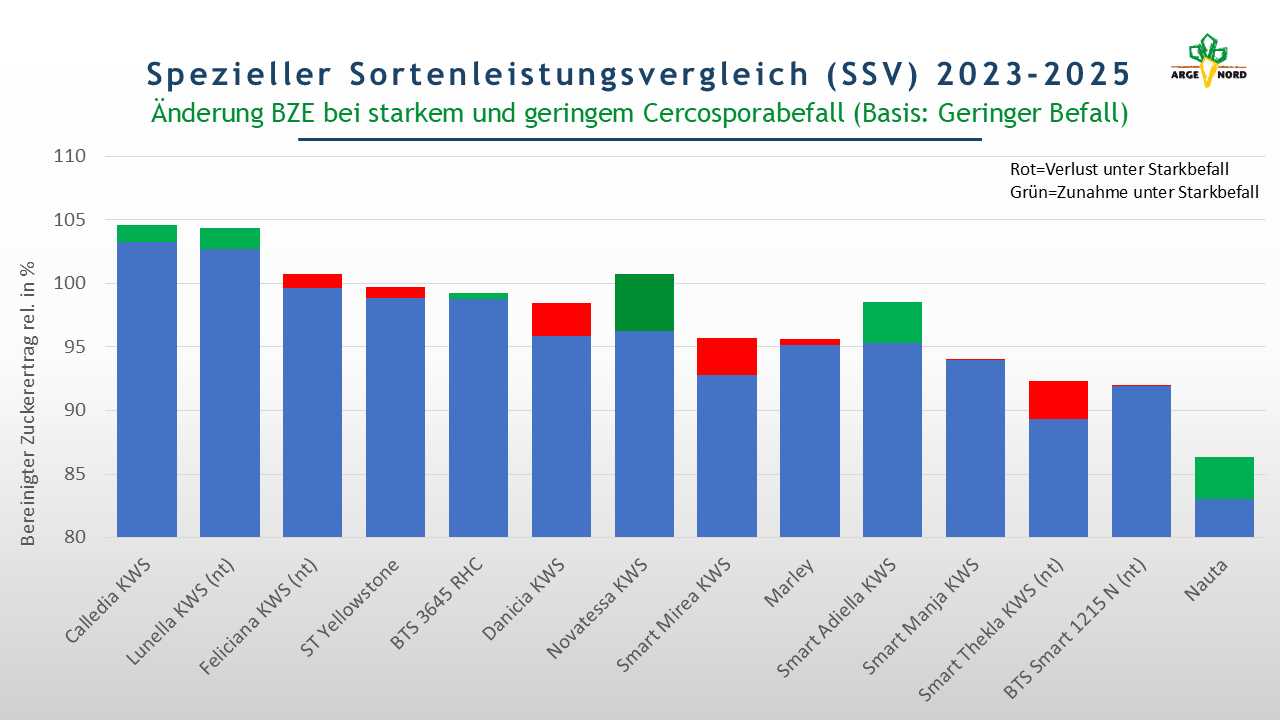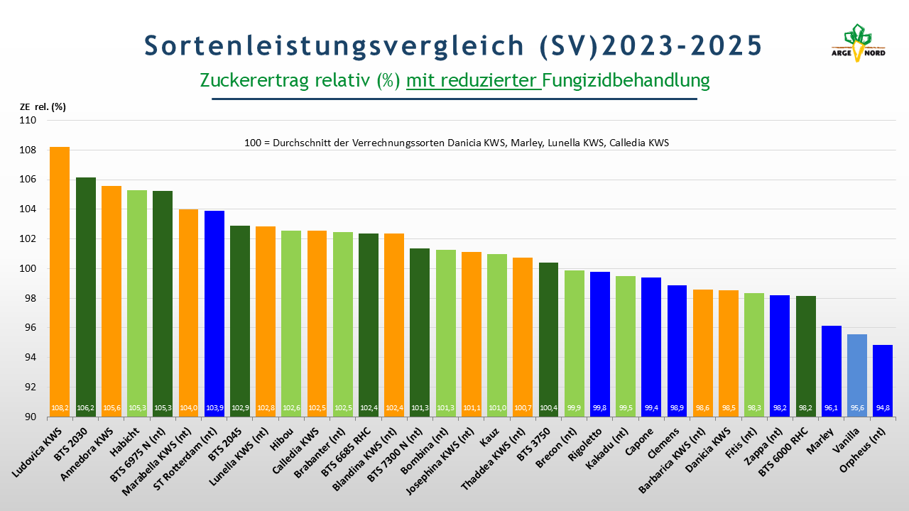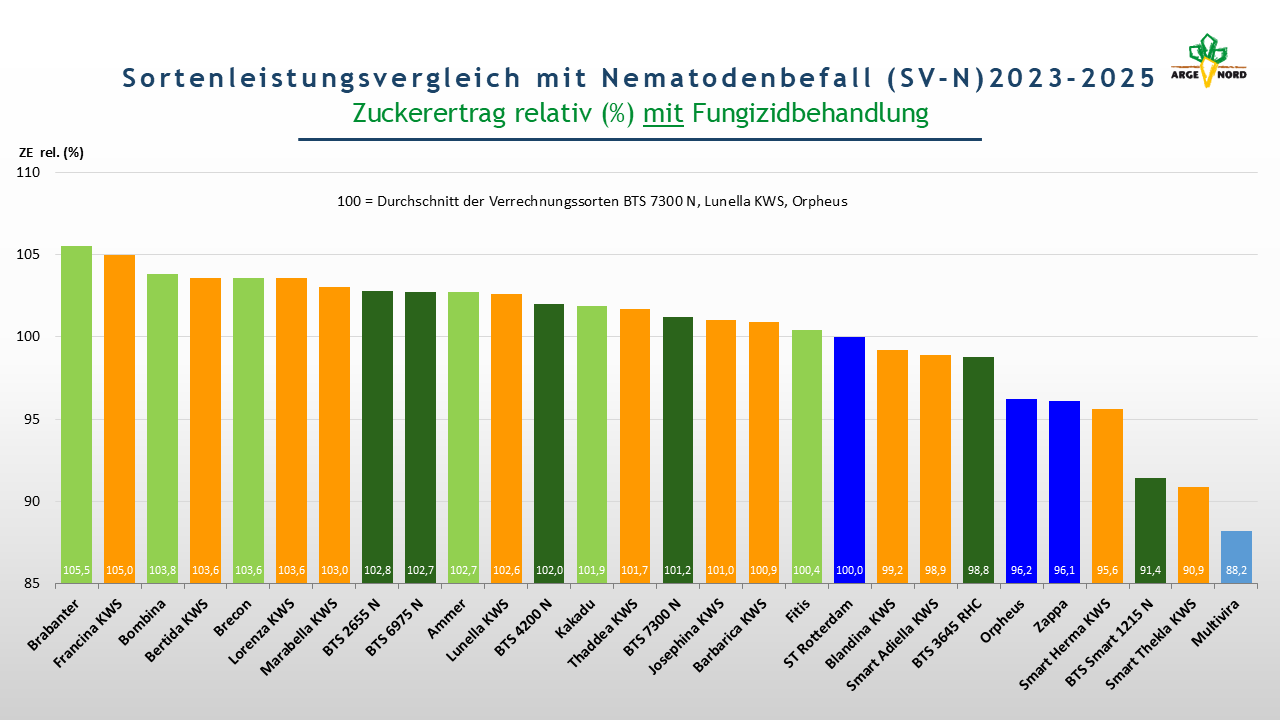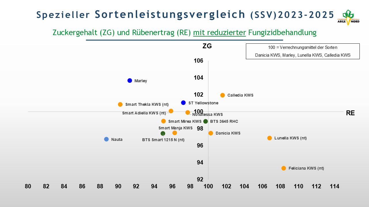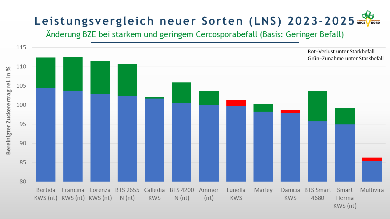 Seit 2024 werden Sortenversuche als Blockanlage in dreifacher Wiederholung angelegt, es gibt nur noch eine Fungizidstufe. Die Versuche ohne Nematodenbefall werden einfaktoriell mit stark reduziertem Fungizideinsatz geprüft. Die Auswertung der Versuche wird trotz der Einstufigkeit in mehreren Befallsstufen dargestellt. Dies wird durch eine Gruppierung der Versuchsergebnisse nach dem Befallsniveau an den jeweiligen Standorten ermöglicht. Je nachdem, wie stark der Befall mit Cercospora beticola ausfällt, kann die Rangfolge im Zuckerertrag oder bereinigten Zuckerertrag stark variieren. Die Darstellung der Sortenleistung erfolgt für 2023 übergangsweise als Mittel der Stufen 1 und 2 (Stufe D) und für 2024 und 2025 mit reduziertem Fungizideinsatz. Versuche mit Nematodenbefall oder Versuche, die auf andere Krankheiten wie SBR abzielen werden möglichst gesund gehalten, damit der Einfluss der Blattkrankheiten möglichst nicht das Ergebnis verfälscht. Feldaufgangszählungen finden im Leistungsvergleich neuer Sorten (LNS) und im SV statt. Da die nematodentoleranten Sorten hier ohne Befall mitgeführt werden, ist keine Zählung im SV-N und der WP-NT notwendig.
