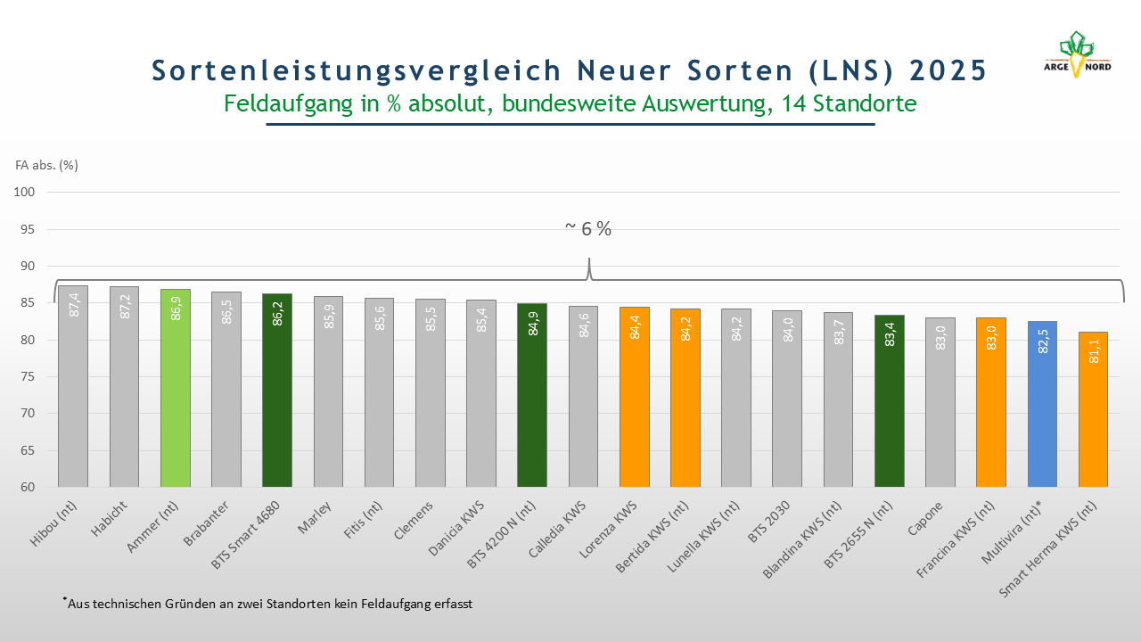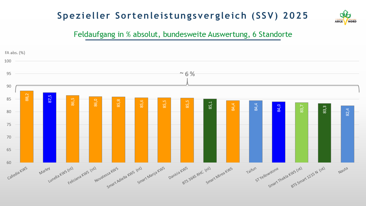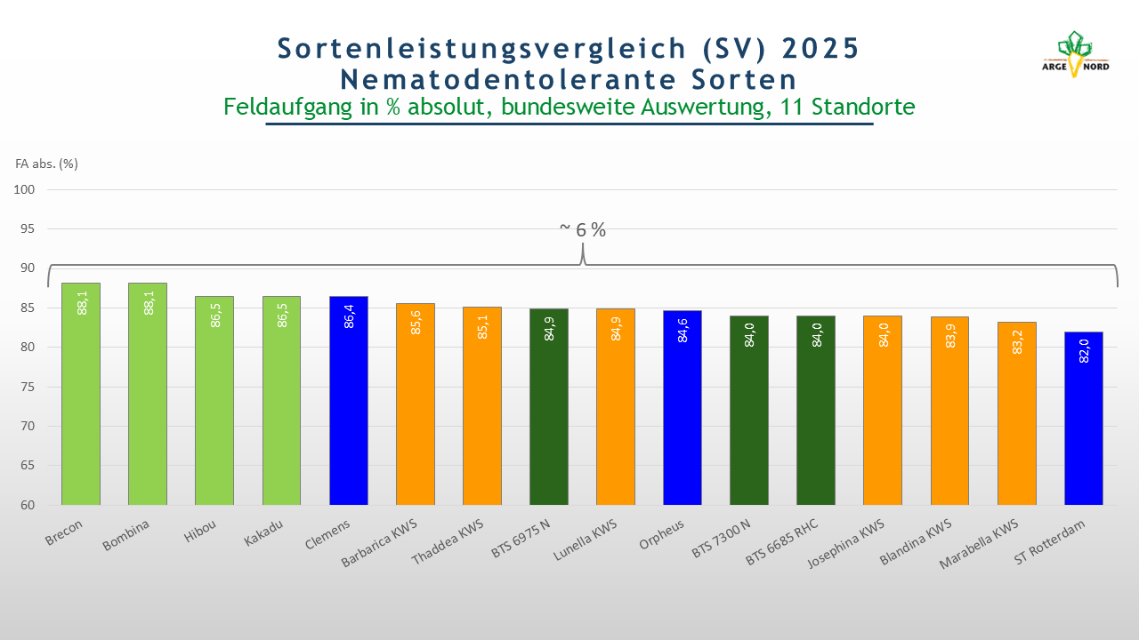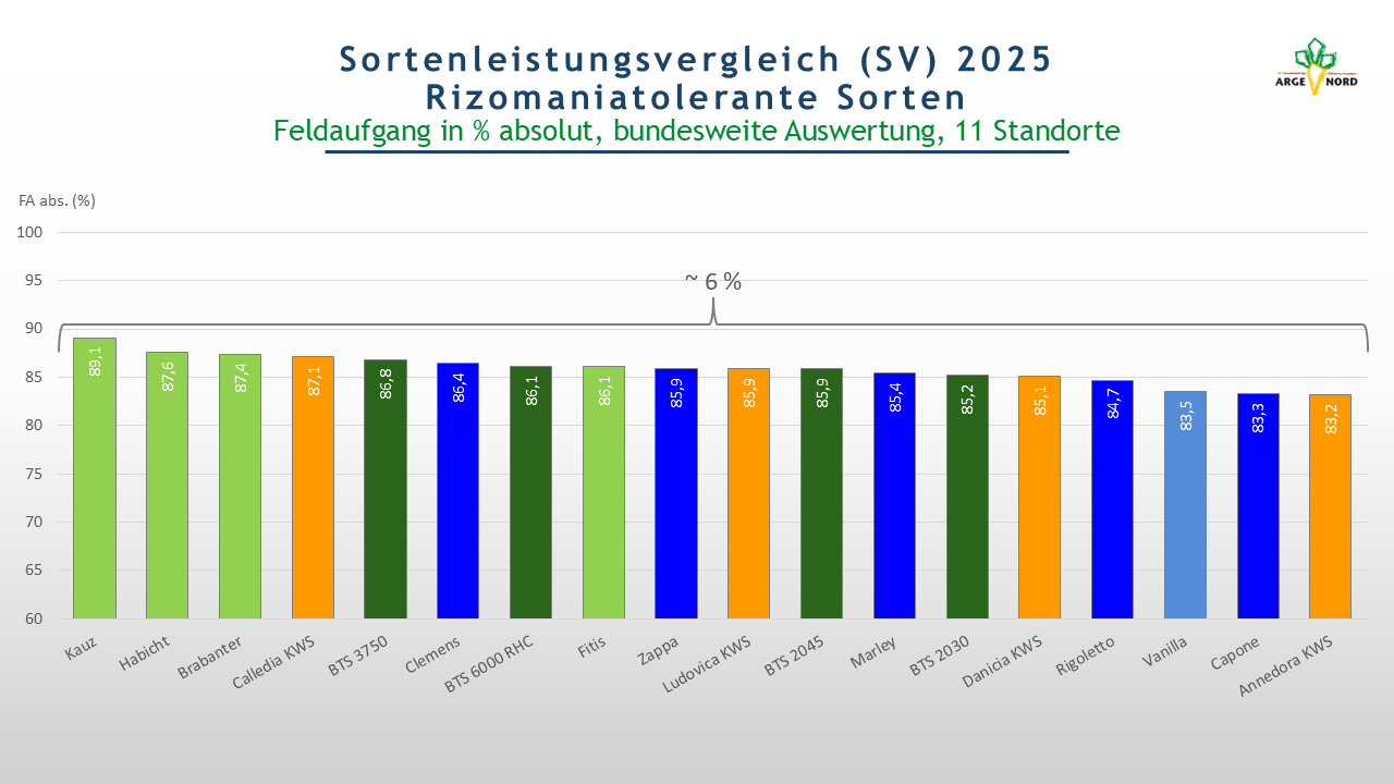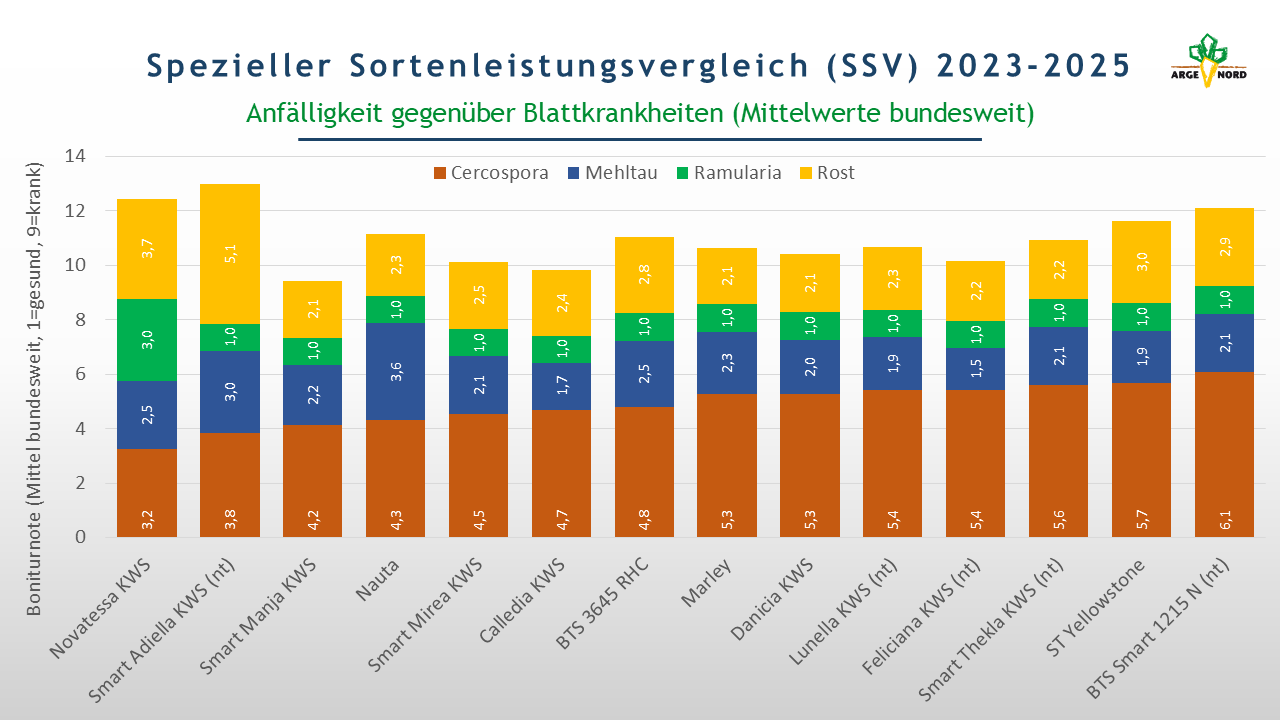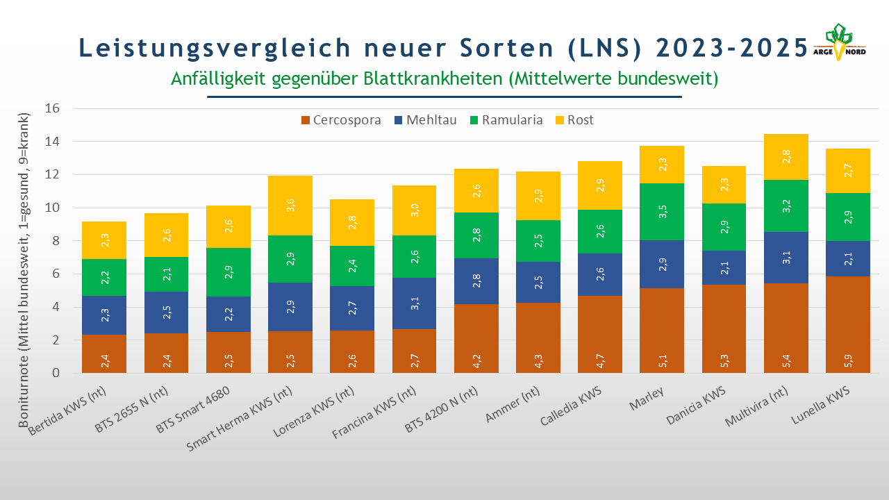 Die ARGE NORD hat im Jahr 2025 sieben SV angelegt, zwei davon mit zusätzlichem Anhang des SSV. Außerdem wurden fünf Wertprüfungen, vier LNS, eine Sonderprüfung zu SBR und zwei Sonderprüfungen zum Rizomaniaresistenzbruch betreut. Des Weiteren prüfen wir in jedem Jahr die Neuzulassungen hinsichtlich ihrer Anfälligkeit gegenüber Aphanomyces/Gürtelschorf.