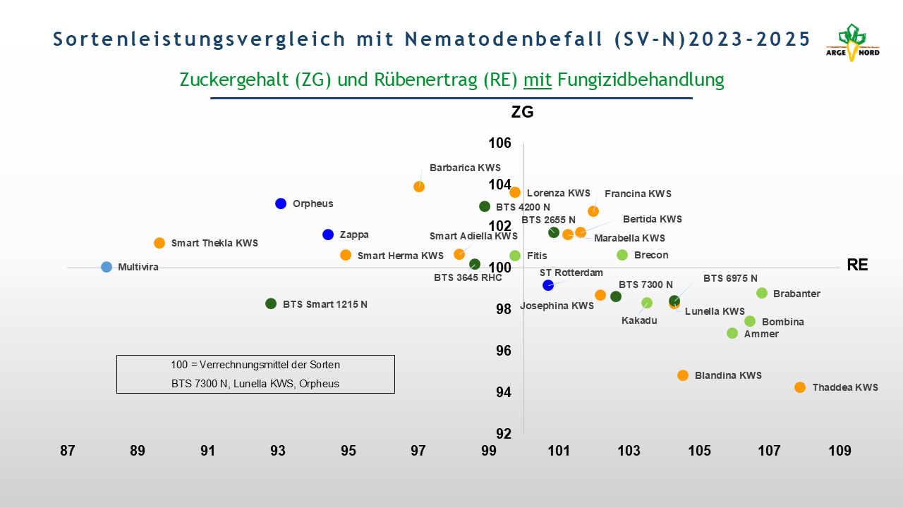 Die Sorten müssen aufgrund ihrer Eigenschaften in verschiedene Sortimente eingeteilt werden, die in der Folge unterschiedliche Standortbedingungen erfordern. Der größte Leistungsvergleich wird auf Flächen ohne Nematodenbefall angelegt. Im Sortenleistungsvergleich (SV) werden sowohl rizomaniatolerante Sorten als auch nematodentolerante Sorten ohne Nematodenbefall getestet. Unter möglichst hohem Nematodenbefall prüft die ARGE NORD die nematodentoleranten Sorten in separaten Versuchen (SV-N). Gleiches gilt für die Wertprüfungen. Hier gibt es die WP-NT, in der in der Zulassung befindliche nematodentolerante Sorten zwei Jahre lang geprüft werden, sowie die WP 1 und WP 2 ohne Nematodendruck. Außerdem gibt es noch weitere Versuche mit besonderen Anforderungen. Die Sonderprüfung SBR mit integriertem SV-SBR wird an Standorten in den bekannten Befallsregionen durchgeführt. Gleiches gilt für Versuche zu den Themen Rhizoctonia und verstärkte Rizomaniatoleranz. An wenigen weiteren Standorten wurden zusätzlich spezielle Sortenversuche (SSV) durchgeführt. In diesen Versuchen werden Sorten mit besonderen Eigenschaften, wie zum Beispiel rhizoctoniatolerante Sorten, unter Nichtbefall geprüft, da sie häufig unter dem Ertragsniveau der normalen Sorten liegen. Ebenfalls enthalten sind die Sorten des Conviso-Smart-Systems. Diese Versuche tragen dazu bei, Sorten zu identifizieren, die unter spezifischen Bedingungen besonders gut abschneiden.