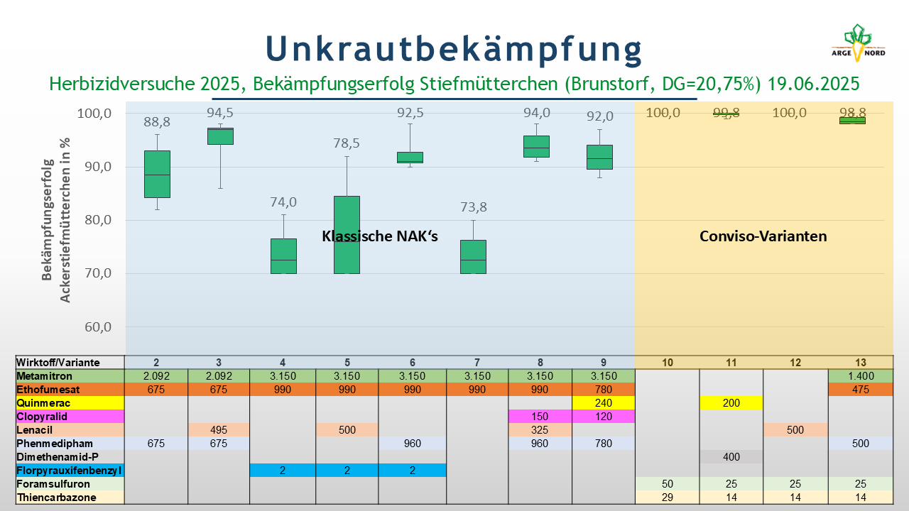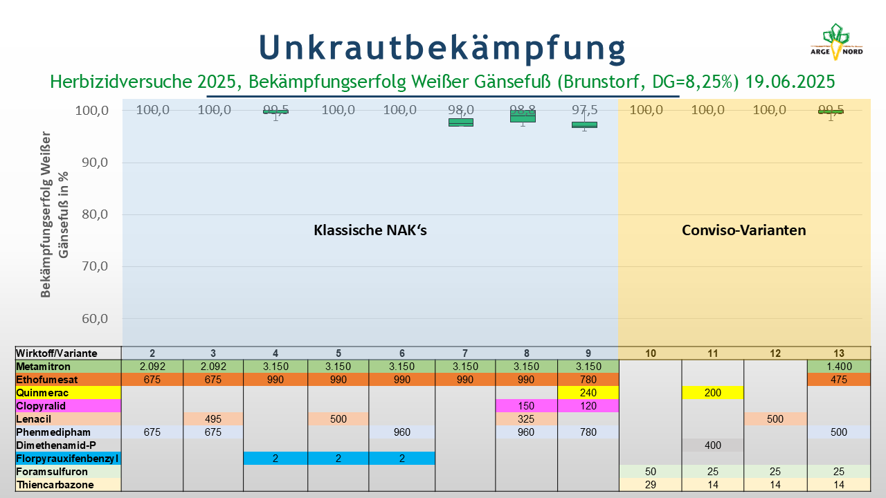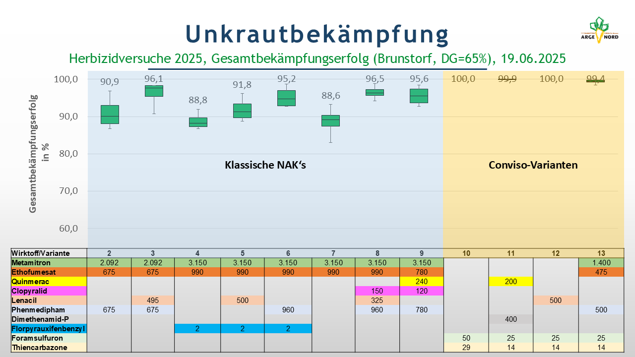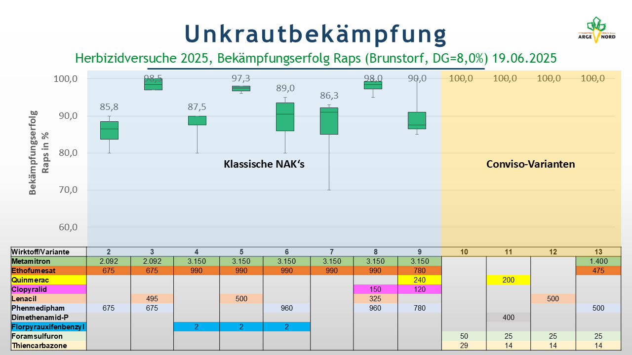 Die ARGE NORD hat im Jahr 2025 auf insgesamt drei Standorten Herbizidversuche (RV-Herbizide) durchgeführt. Das Ziel der Versuchsanstellungen lag darin, Wirkstoffe und Produkte auf ihre Wirksamkeit gegen Unkräuter zu testen. Ein besonderer Fokus wurde, aufgrund des Wegfalls des Wirkstoffs Triflusulfuron (Produkte: Debut, Shiro), auf die Bekämpfung von Vogelknöterich (POLAV) und Raps (BRANA) gelegt.