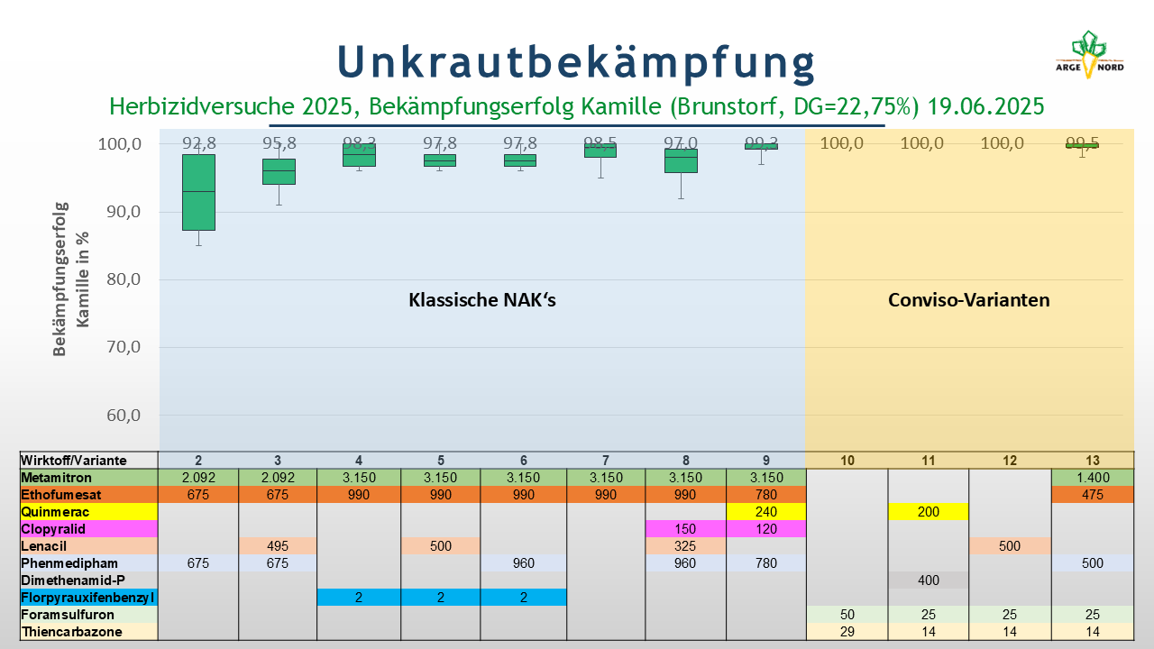 Mischverunkrautung bestehend aus weißem Gänsefuß (CHEAL), Ausfallraps (BRANA), Ackerstiefmütterchen (VIOAR) und Echter Kamille (MATCH). So wurde in den unbehandelten Kontrollen am 19.06.2025 ein mittlerer Deckungsgrad des weißen Gänsefußes von 8,3 %, des Ausfallraps von 8,0 %, des Ackerstiefmütterchens von 20,8% und der echten Kamille von 22,8 % festgestellt. Die Aussagekraft zur Bekämpfungsleistung der Herbizide gegenüber Ausfallraps, Kamille und Hirse ist somit gegeben. Weitere Unkräuter werden unter HERBA zusammengefasst und gehen wie die zuvor genannten in die Berechnung des Gesamtbekämpfungserfolgs ein.