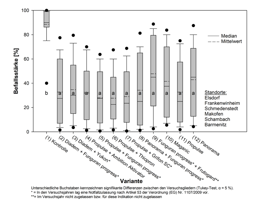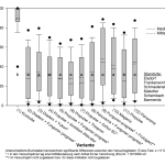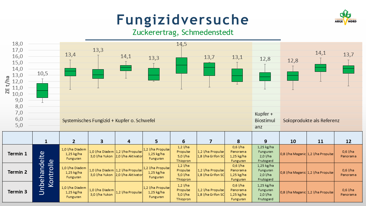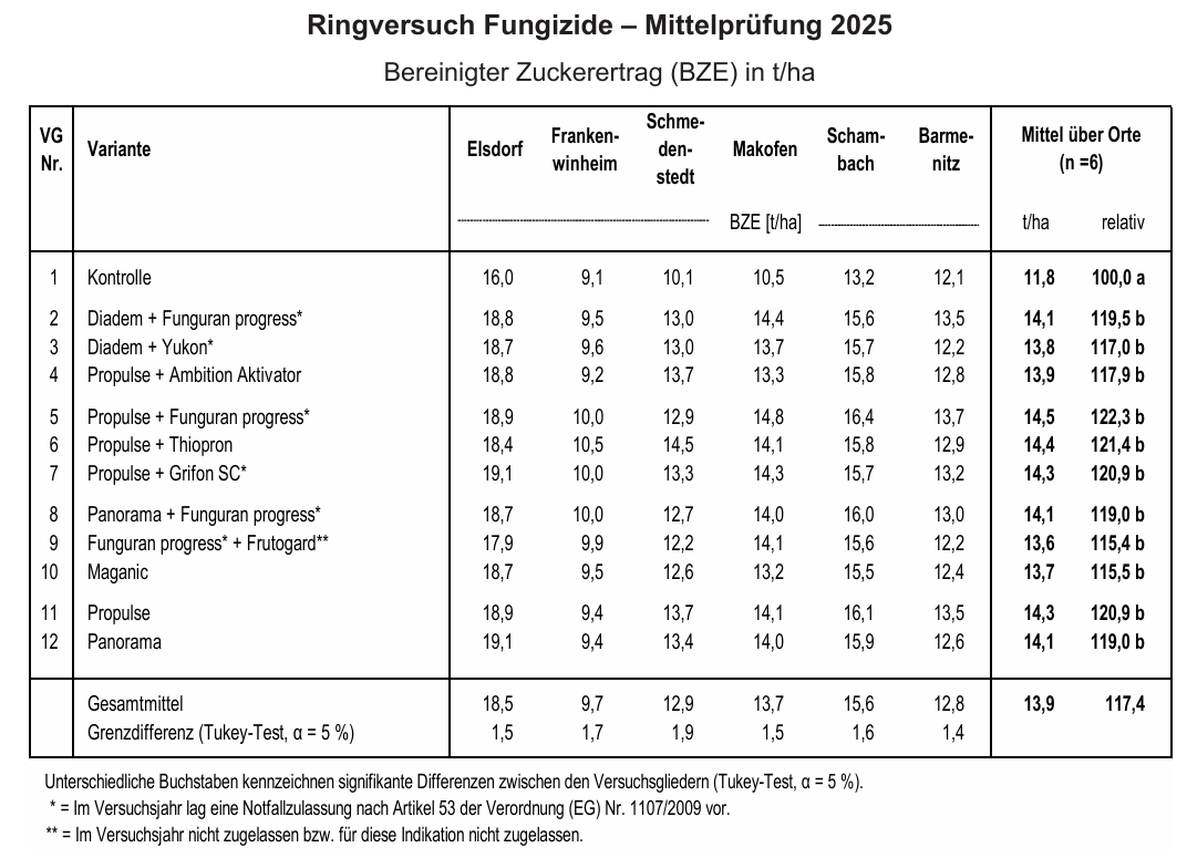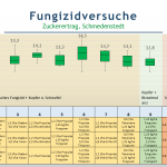 Verglichen wurde die Wirkung der Fungizidprodukte und -kombinationen der einzelnen Varianten untereinander sowie mit der unbehandelten Kontrolle der Sorte BTS 7300 N gegen Cercospora. Die Varianten zeigten Anfang September Differenzierungen in ihrer Wirkung gegenüber Cercospora. So konnte vor allem in der Variante 6, eine Kombination aus Propulse und dem schwefelhaltigen Produkt Thiopron, eine verbesserte Wirkung gegen Cercospora beobachtet werden, welches sich auch im Zuckerertrag widerspiegelte (14,5 t/ha). Im Vergleich zur Solovariante mit Propulse führte die Kombination aus Propulse und Thiopron zu einer Zuckerertragssteigerung von knapp 0,5 t/ha. Auch im Vergleich zu den anderen Varianten mit Zusatz von Kupfer, zeigte die schwefelhaltige Variante mit Thiopron den höchsten Zuckerertrag. Allerdings ist diese Steigerung im Zuckerertrag statistisch nicht absicherbar, sodass eine weitere Prüfung notwendig wäre.