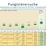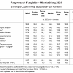 Ausgesät wurde der Versuch mit der Sorte BTS 7300 N am 24.03.2025 in Engsaat. Anschließend wurde auf ca. 20 cm vereinzelt. Ab Anfang Juni wurde der Versuch wöchentlich auf Blattkrankheiten wie Cercospora, Rost und Mehltau kontrolliert. Bereits am 19.06.2025 wurden erste Cercospora-Blattflecken in dem Bestand beobachtet. Die Fungizidapplikationen erfolgten nach Erreichen der Bekämpfungsschwellen. Die erste Applikation wurde am 27.06.2025 nach Überschreiten der Bekämpfungsschwelle von 5 % gesetzt. Es folgten zwei weitere Fungizidbehandlungen der jeweiligen Varianten 2-12 am 04.08.2025 und am 25.08.2025. Nach Erreichen einer Befallshäufigkeit von 100 % wurden die Varianten ungefähr im wöchentlichen Rhythmus auf Befallsstärke bonitiert. Beerntet wurde der Fungizidversuch am 28.10.2025.
