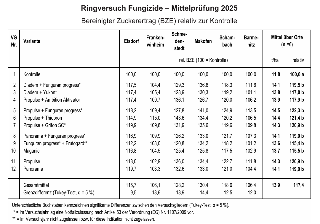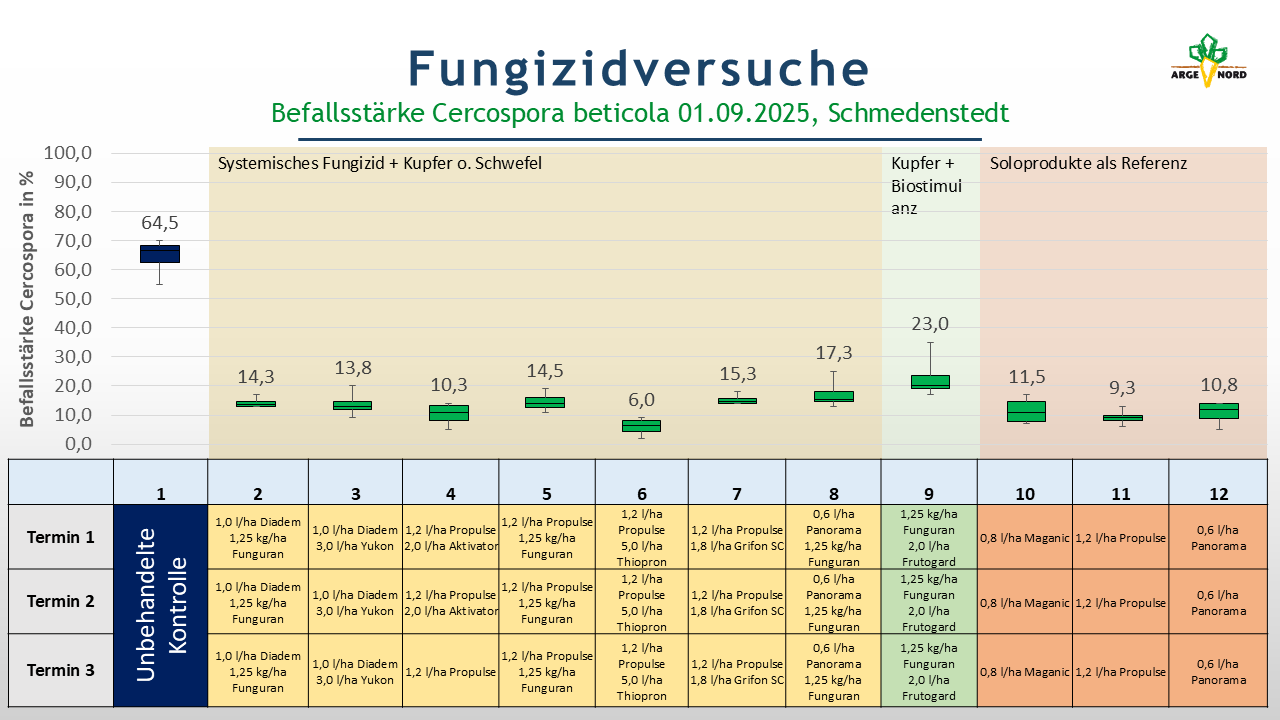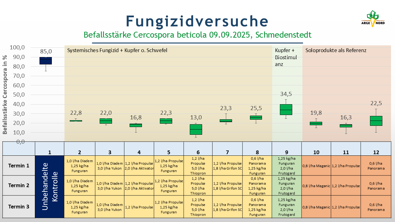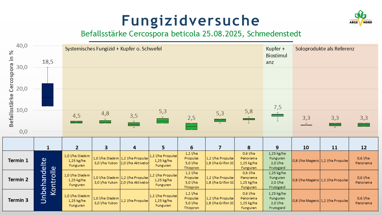 Im Versuchsjahr 2025 wurde ebenso wie in den vergangenen Jahren der Ringversuch Fungizide, welcher durch das Institut für Zuckerrübenforschung koordiniert wird, durch die ARGE NORD e.V. durchgeführt. Der Versuchsstandort war in 2025 der Standort Schmedenstedt im Landkreis Peine. Der diesjährige Ringversuch beinhaltete 12 verschiedene Varianten (s. Variantenplan). Neben der unbehandelten Kontrolle wurden die Produkte Diadem, Propulse und Panorama in Kombination mit kupferhaltigen Produkten, wie Funguran Progress, Yukon und Grifon SC getestet. Weitere Varianten sollten die Zusatzwirkung des schwefelhaltigen Produktes Thiopron, des manganhaltigen Produktes „Aktivator“ und des Produktes Frutogard, welches Kaliumphosphit enthält, untersuchen.