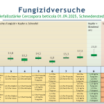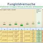 Die unterschiedlichen Produktkombinationen aus Diadem (Mefentrifluconazol + Fluxapyroxad) und einem kupferhaltigen Produkt (Var. 2 und 3) sowie die Kombination aus einem prothioconazolhaltigem Produkt (Propulse/Panorama) und Kupfer (Var. 5, 7 und 8) schnitten in der Befallsstärke sowie im Zuckerertrag alle ähnlich ab. Auch die Solovariante mit Propulse konnte ein ähnlich hohes Ertragsniveau erzielen (Var. 11). Variante 4, eine Kombination aus Propulse und einem manganhaltigen Produkt (Aktivator) zeigte keinen Zusatzeffekt auf den Zuckerertrag. Die Varianten sahen Anfang September lediglich etwas sauberer aus. Die Kombination aus Funguran Progress (Kupfer) und Frutogard als Biostimulanz wies die höchste Befallsstärke im September auf. Dies zeigte sich ebenfalls im Zuckerertrag, welcher deutlich niedriger lag.