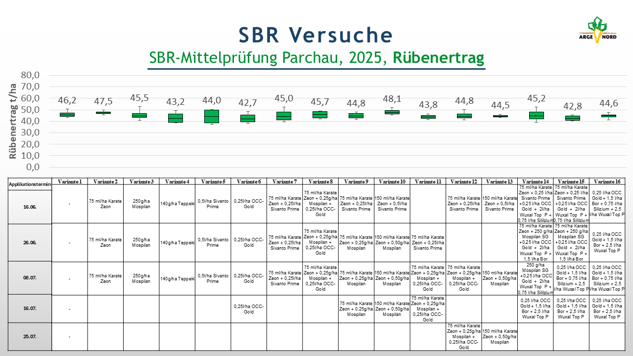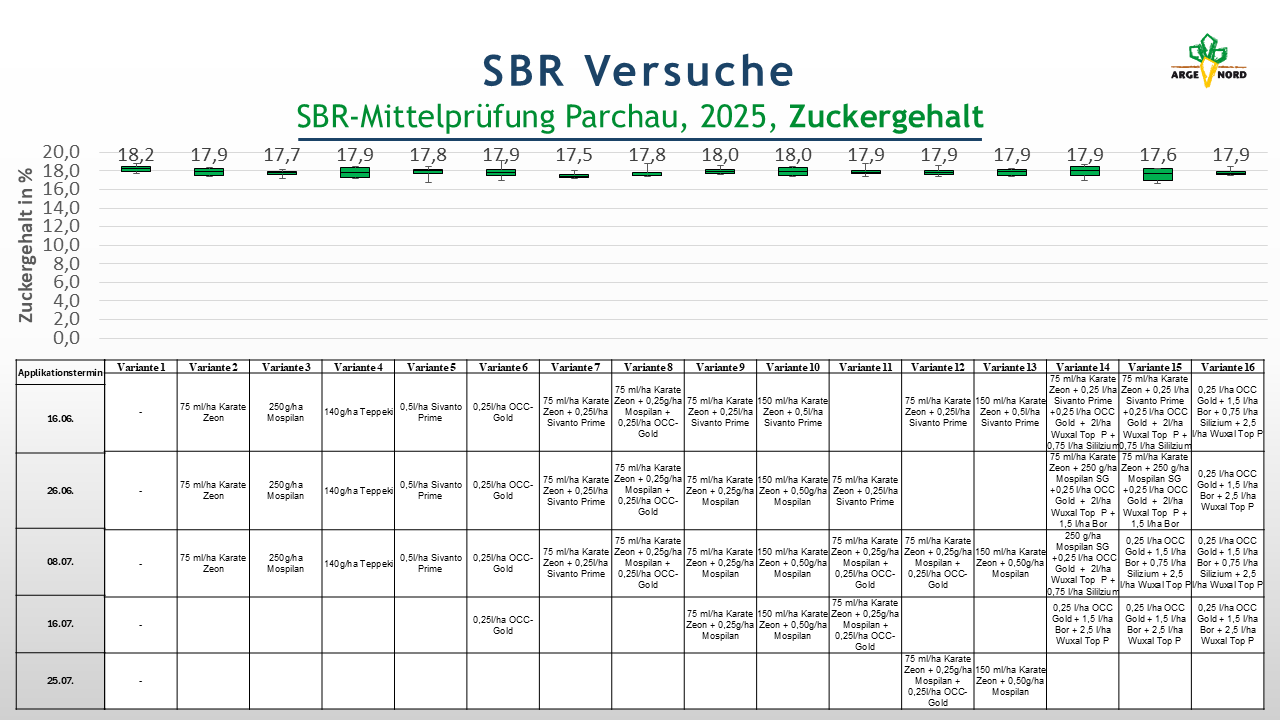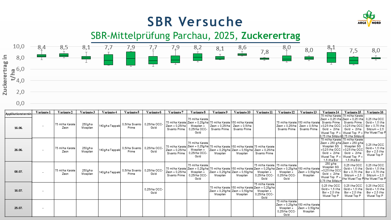 In der Mittelprüfung, die koordiniert über die Südzucker AG in mehreren Regionen angelegt wurde, wurden verschiedene Insektizide und Insektizidkombinationen getestet. Eine Bonitur auf Symptomausprägung erfolgte nicht. Auch in dieser Versuchsserie sollte der Bekämpfungserfolg indirekt über den Ertrag ermittelt werden. Ebenso wie der Abdeckversuch litt auch die Mittelprüfung unter starker Trockenheit. Die Zuckererträge liegen deshalb auf sehr niedrigem Niveau. Zwischen den Insektizidvarianten bestehen auf dem Standort Parchau keine signifikanten Unterschiede. Die Gründe dafür können vielschichtig sein. Am wahrscheinlichsten ist es, dass der Trockenstress die Krankheitseffekte überlagert. Andere Gründe können die niedrige Zikadenpopulation oder die nicht vorhandene Wirkung der Insektizide sein.
